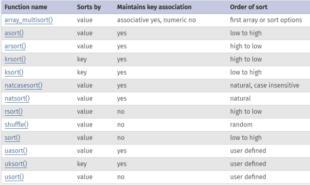 asort() (funzione PHP) ordina un array in modo ascendente in base al valore dei suoi elementi, senza modificarne gli indici. Restituisce un valore booleano, a seconda che l’operazione riesca (true) o meno (false).